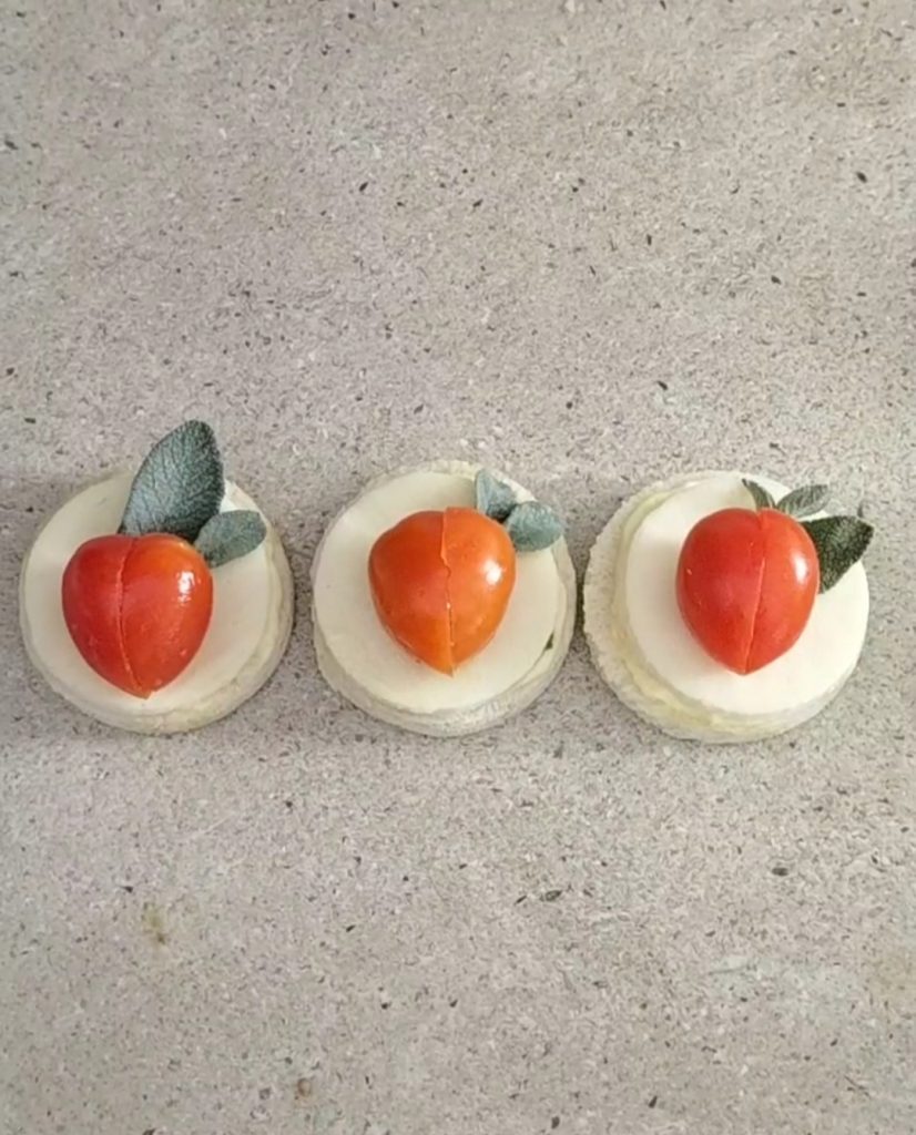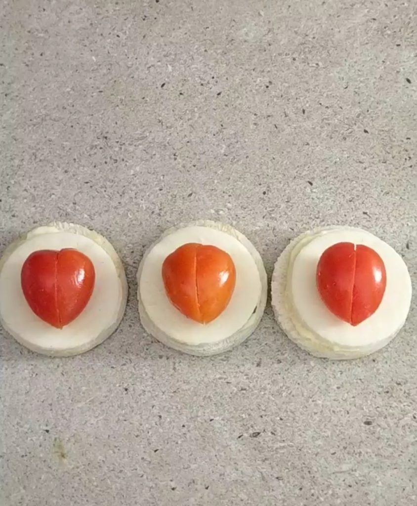 Obenauf kommt die Herzchen-Tomate. Das Reel, das erklärt, wie man es macht, finden Sie, indem Sie hier klicken.
