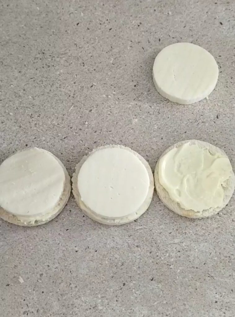Dasselbe mit den aus dem Käseblock geschnittenen Scheiben tun, jedoch mit einem Ausstecher mit einem Durchmesser von 5 cm.