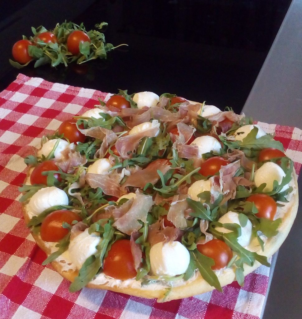 • Bestreichen Sie die Oberfläche mit dem Frischkäse, dekorieren Sie mit den halbierten Kirschtomaten, die zuvor mit Salz, Öl und Oregano gewürzt wurden, den halbierten Mozzarella-Kugeln, der Rucola und dem Schinken.
