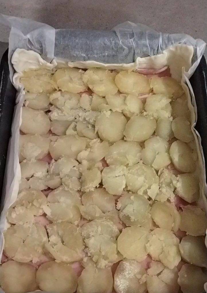 Legen Sie die Scheiben Speck auf den Blätterteig.