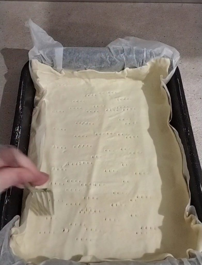 Legen Sie Backpapier auf ein rechteckiges Backblech mit den Maßen 31×23 cm, darauf den Blätterteig und mit einer Gabel einstechen.