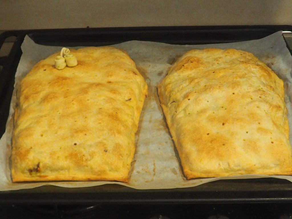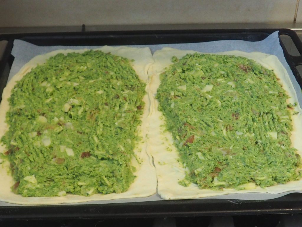 Die ersten beiden Rechtecke auf ein mit Backpapier ausgelegtes Backblech legen, auf jedes die Hälfte der Brokkolimischung geben und versuchen, sie in Form eines Sargs zu modellieren (ich habe einen Stock benutzt)