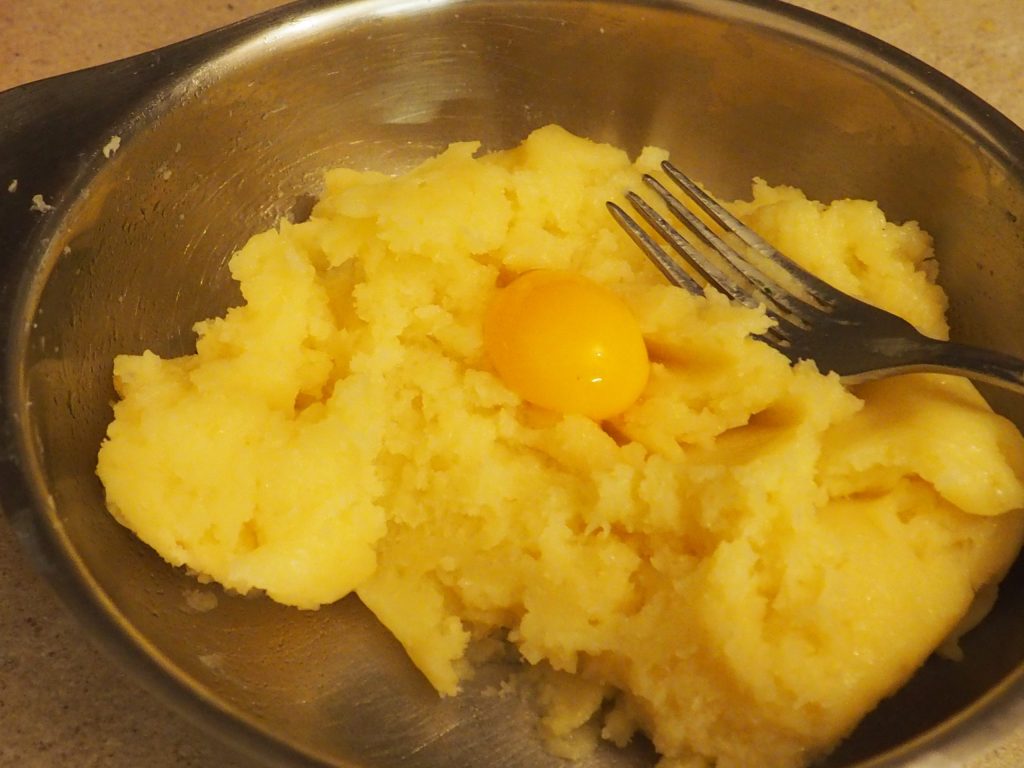 Sobald die Masse leicht abgekühlt ist, fügen Sie die Eigelbe einzeln hinzu, lassen Sie eins einarbeiten und fügen Sie dann das andere hinzu.