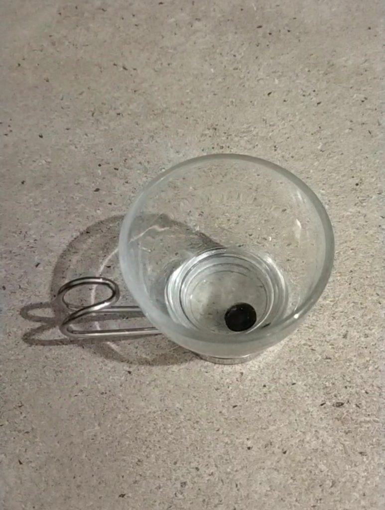 Geben Sie ein wenig Wasser in eine Tasse und lösen Sie die Aktivkohletablette darin auf.