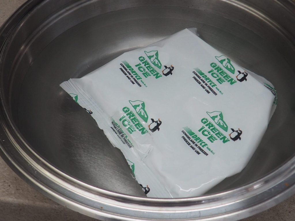 Gebt in eine Schüssel kaltes Wasser und einen Beutel mit synthetischem Eis, wenn ihr keinen habt, gehen auch Eiswürfel.