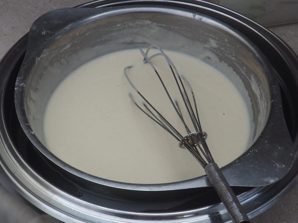 Fügt das kalte Bier aus dem Kühlschrank hinzu, beginnt mit dem Mischen, gebt auch das feine Salz hinzu und schlagt mit einem Schneebesen, bis eine glatte und homogene Mischung entsteht.