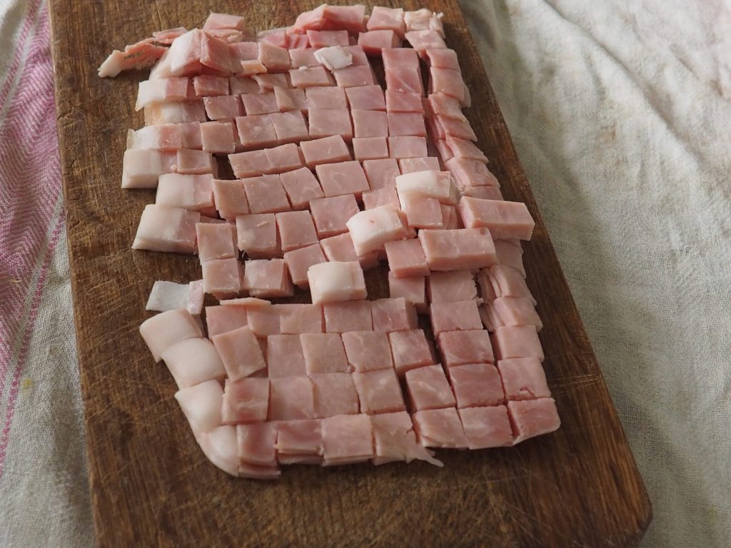 Sie können auch Schinken in Stückchen oder eine dicke Scheibe Schinken verwenden und in Würfel schneiden.