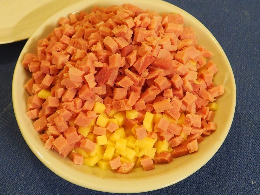 Während die Kartoffeln kochen, den Käse und den gekochten Schinken in kleine Würfel schneiden und auf einen Teller legen.