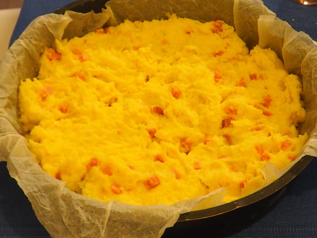 Eine Backform mit einem Durchmesser von ca. 30 cm mit einem mit Wasser angefeuchteten und gut ausgewrungenen Backpapier auslegen (wenn gewünscht, leicht einfetten), den Boden mit zwei Esslöffeln Semmelbrösel bestreuen und die Kartoffelmasse darauf verteilen, indem kleine Häufchen nebeneinander gelegt werden. Mit den Händen festdrücken und ebnen.