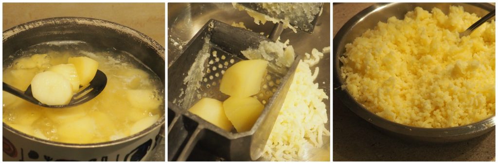 Holen Sie sie mit einem Schaumlöffel heraus und drücken Sie sie durch die Kartoffelpresse.