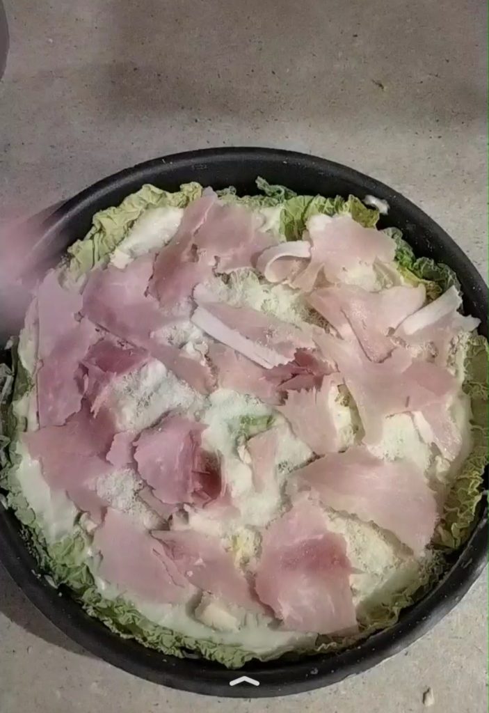 Noch eine Schicht Kohl, Béchamelsauce, gekochter Schinken, Käse und Parmesan.