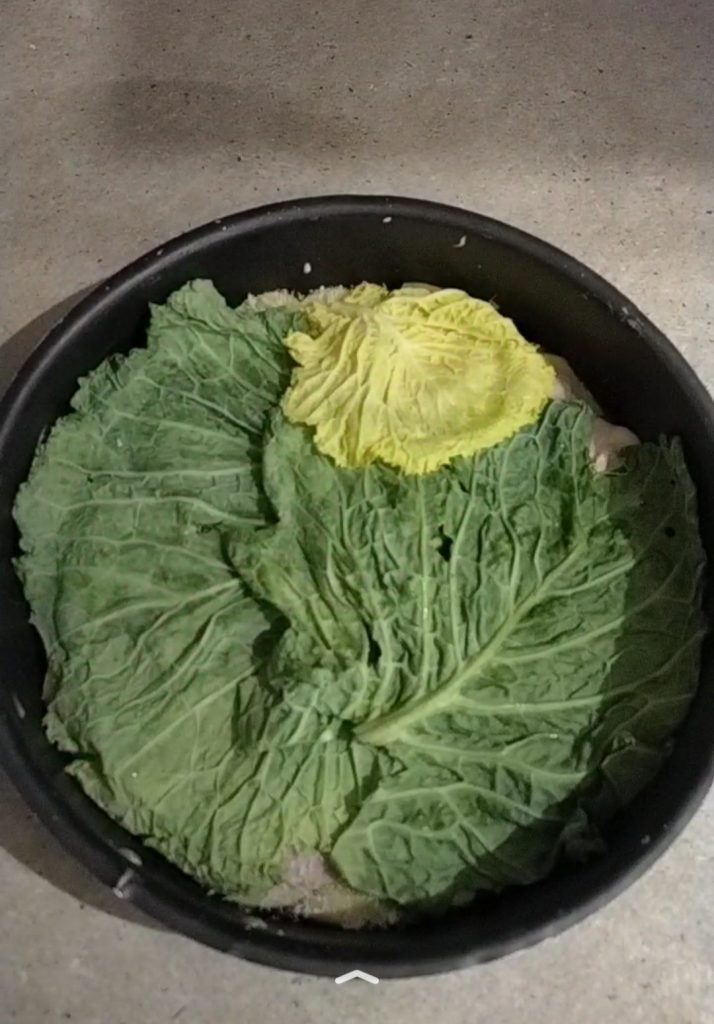 Machen Sie eine Schicht mit einigen gewaschenen Kohlblättern, entfernen Sie den harten Mittelteil.