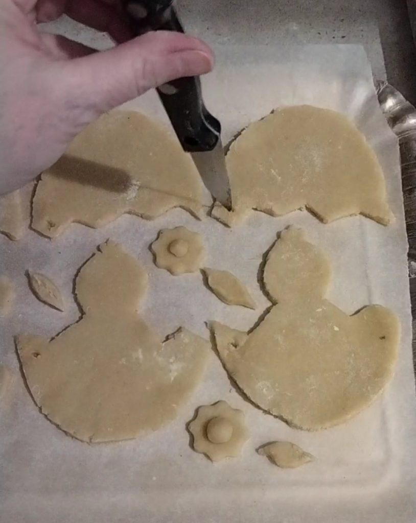 Teilen Sie den Mürbeteig in zwei Teile, rollen Sie ihn auf etwa 0,5 cm Höhe aus. Legen Sie die Formen auf das Backpapier und schneiden Sie die Konturen mit einem scharfen Messer aus.