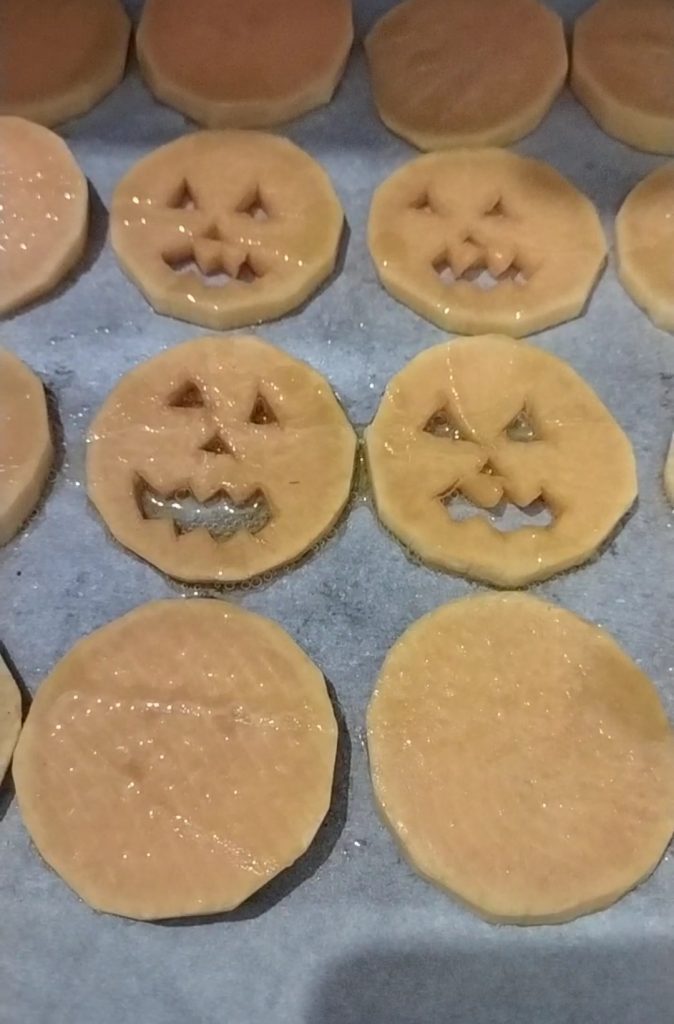 Legen Sie die acht Gesichter und die acht Basen (nicht geschnitzt) nun auf das mit Backpapier ausgelegte Backblech, würzen Sie sie mit ein wenig Öl und feinem Salz. Backen Sie sie bei 180° für etwa 20 Minuten. Sie sollten noch leicht roh sein.
