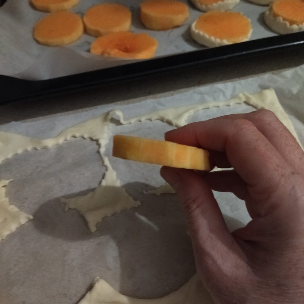 Schneiden Sie mit einem Keksausstecher Kreise aus dem Blätterteig, die etwa einen halben Zentimeter über den Rand der Kürbisscheibe hinausragen (ich habe eine Form mit einem Durchmesser von 7,5 cm verwendet).