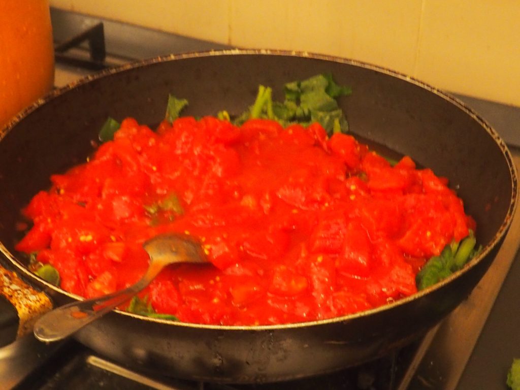 In einer Pfanne das Öl erhitzen, den Knoblauch hinzufügen und die geschälten Tomaten in Stücke geschnitten dazugeben. Etwa 5 Minuten köcheln lassen, leicht salzen.