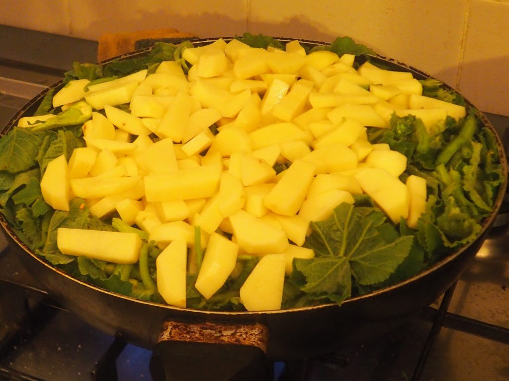Die Kürbistriebe (oder -spitzen) mit Kartoffeln und geschälten Tomaten können auch als Pastasauce verwendet werden.