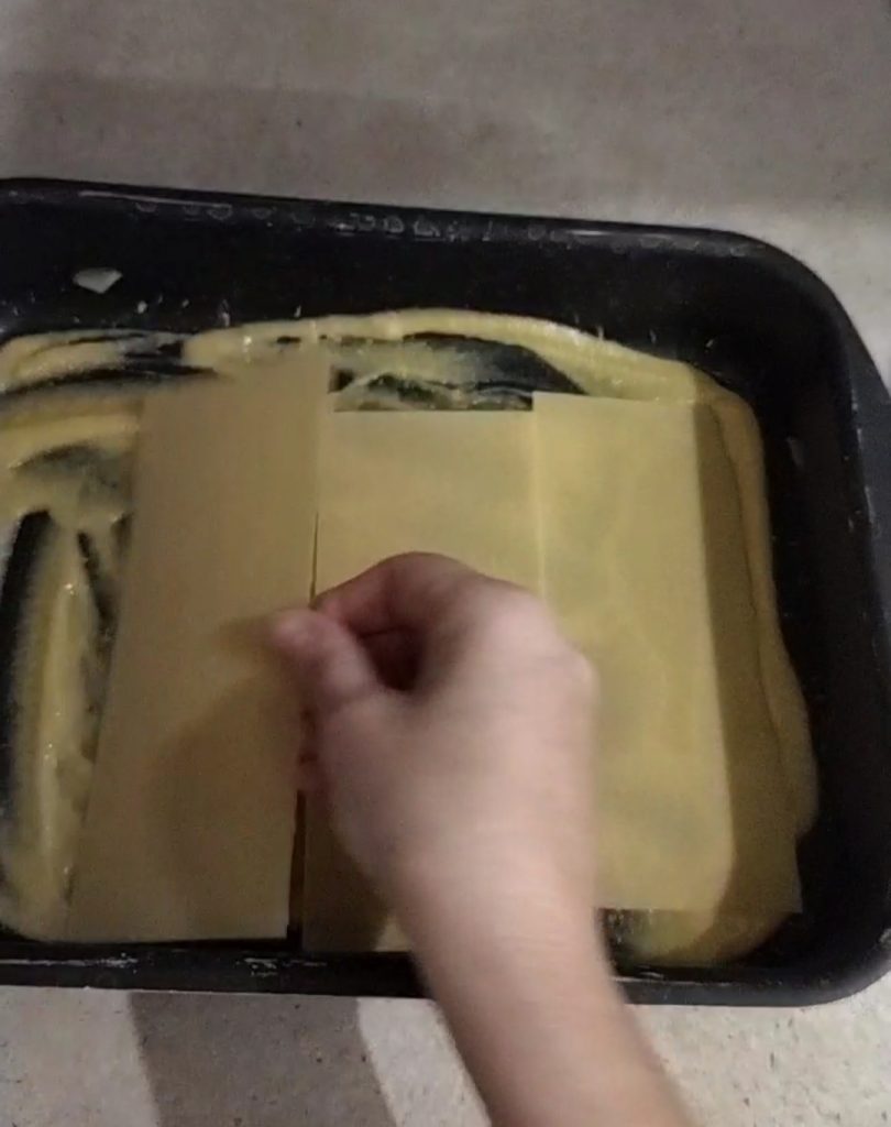 Beginnen Sie mit dem Zusammenstellen der Lasagne, indem Sie eine dünne Schicht Kürbis-Béchamel auf den Boden der Auflaufform geben und darauf eine Schicht Lasagne legen. Ich habe eine rechteckige Auflaufform mit den Maßen 31 cm x 23 cm verwendet.