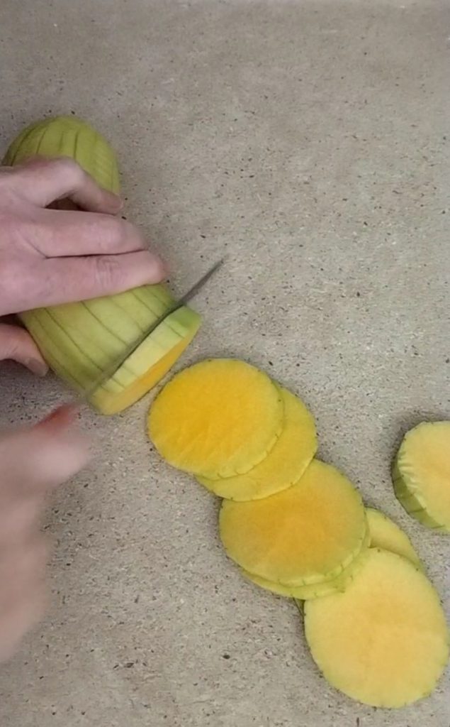 Schälen Sie den Kürbis, ich benutze normalerweise einen Sparschäler. Schneiden Sie ihn in nicht zu dünne Scheiben.