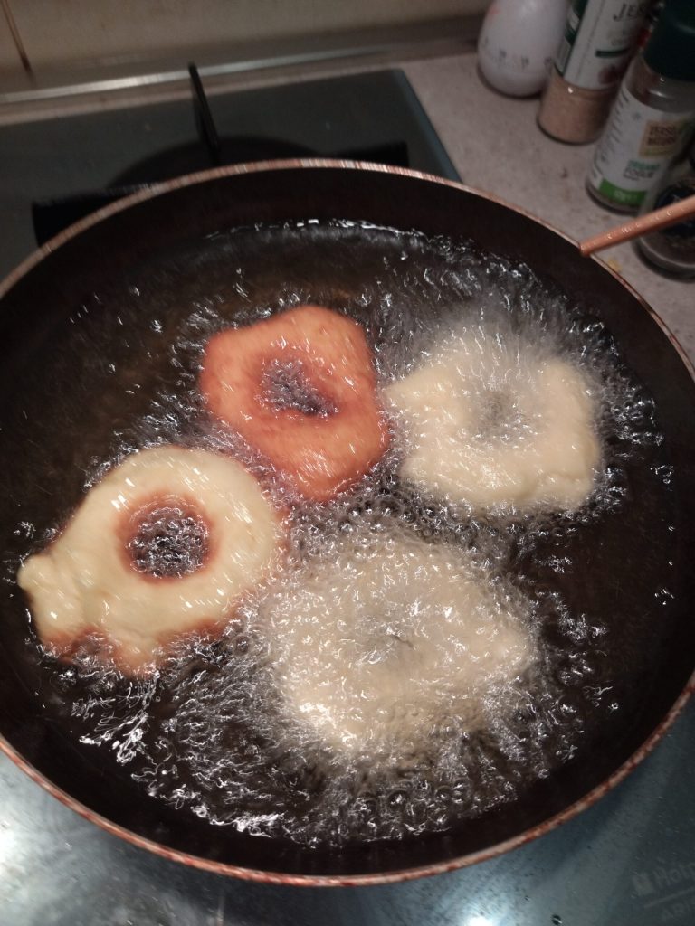 Befeuchtet die Finger mit Pflanzenöl, sonst klebt der Teig an den Fingern. Nehmt Kugeln von etwa 50 g, macht ein Loch in der Mitte. Es sollten etwa zwanzig Stück werden.