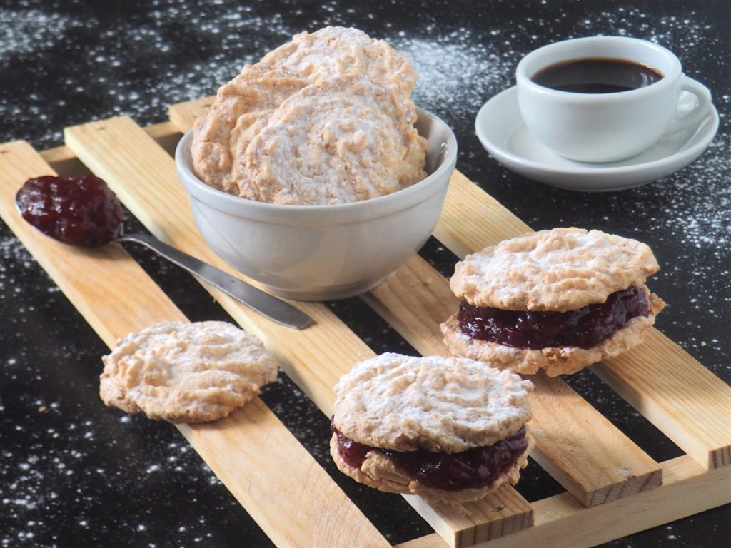 Diese Mandel- und Kokosplätzchen sind unglaublich lecker! Sie sind auch gefüllt hervorragend: Ich habe selbstgemachte Kirschmarmelade gewählt, aber Sie können sie auch mit Orangenmarmelade kombinieren, wenn Ihnen der Kontrast zwischen Süßem und Saurem gefällt. Diese Plätzchen sind auch ideal für Zöliakie-Betroffene, da ich Kokos- und Mandelmehl verwende.