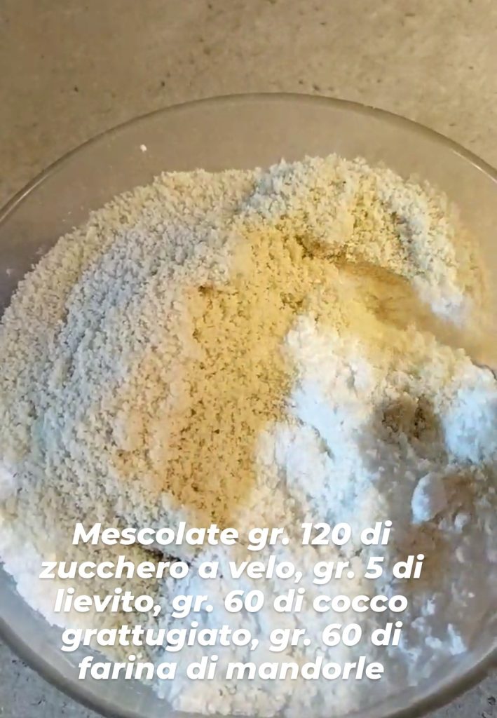Geben Sie in eine Schüssel den Puderzucker, das Backpulver, den Kokosnussmehl und das Mandelmehl, mischen Sie die Zutaten gut durch.