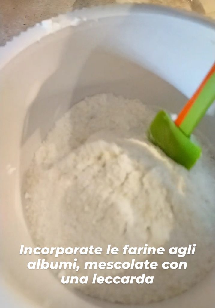 Nun heben Sie die Mehle unter die steifen Eiweiße und mischen Sie vorsichtig mit einem Spatel.