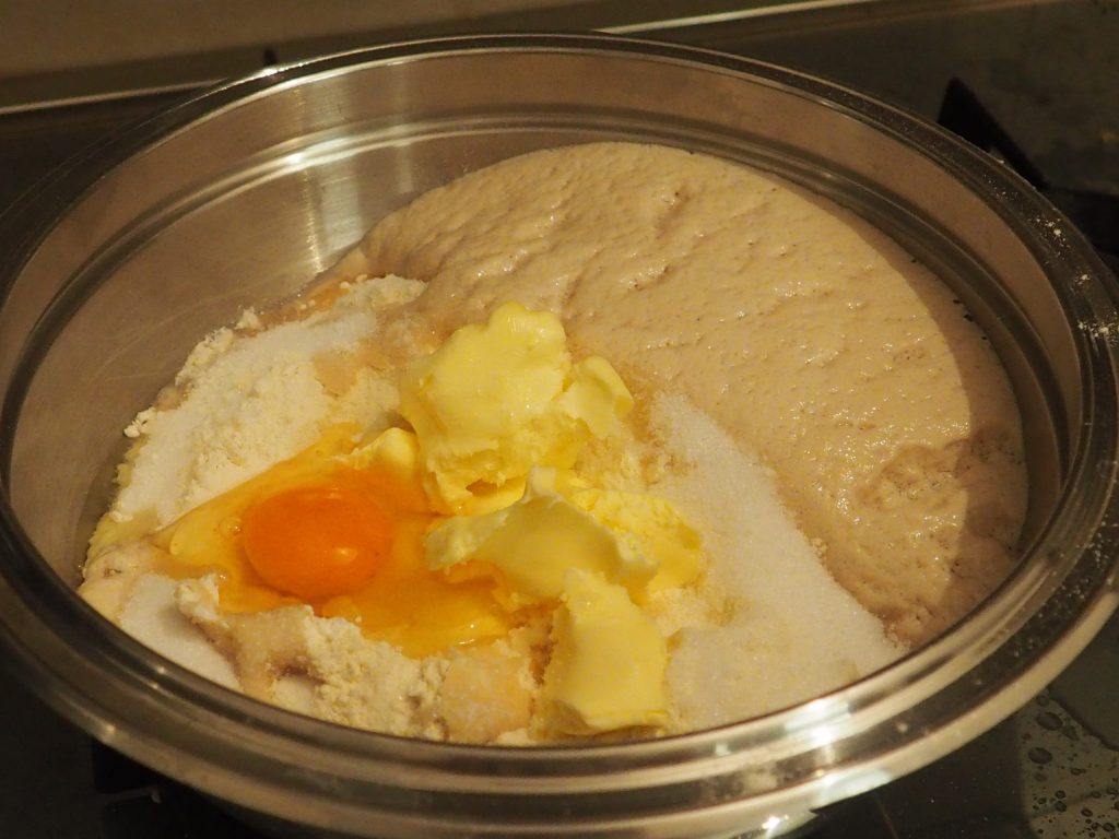 Geben Sie in eine Schüssel das Mehl, fügen Sie den Vorteig, das Ei, die weiche Butter, den Zucker und die Prise Salz hinzu, entfernt von der Hefe.
