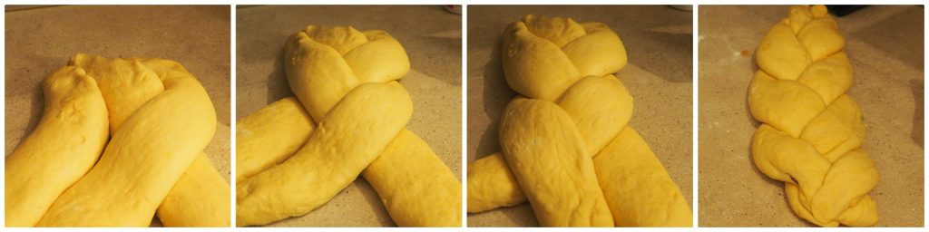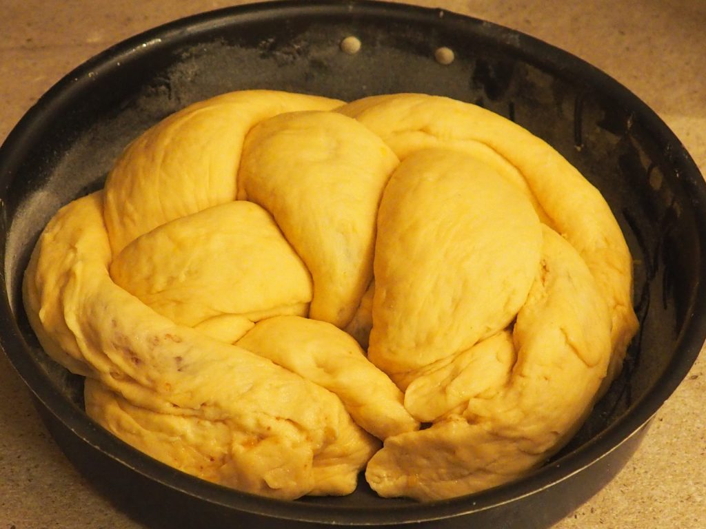 Eine 26 cm Durchmesser große Form mit Butterspray (Lebensmitteltrennmittel für Backformen) einfetten und den Zopf hineinlegen, die Enden vorne schließen.