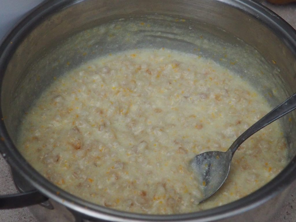 Fügen Sie 300 ml Milch, 20 g Butter und die geriebene Schale einer Orange hinzu.