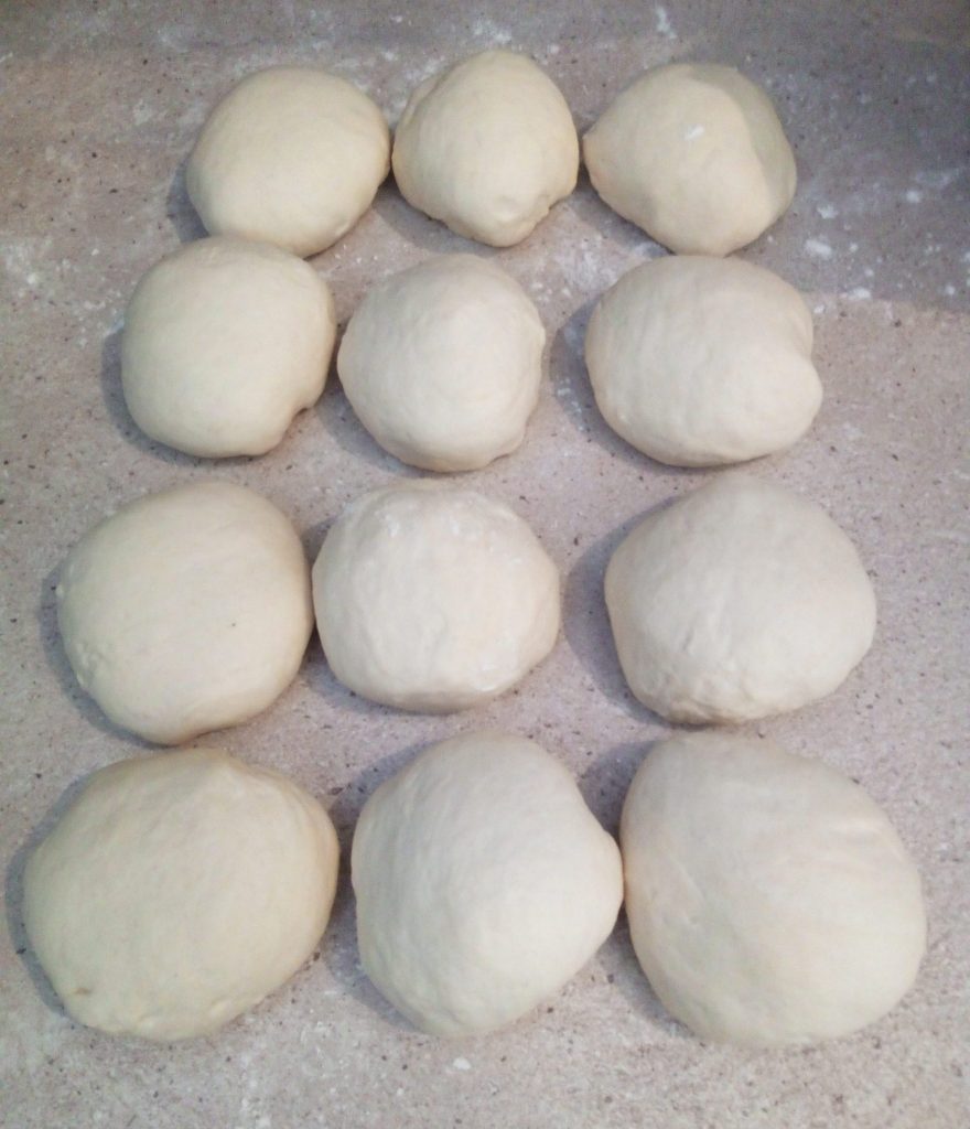 • Nehmen Sie jetzt den Teig, teilen Sie ihn in 12 Kugeln mit einem Gewicht von etwa 130 g.