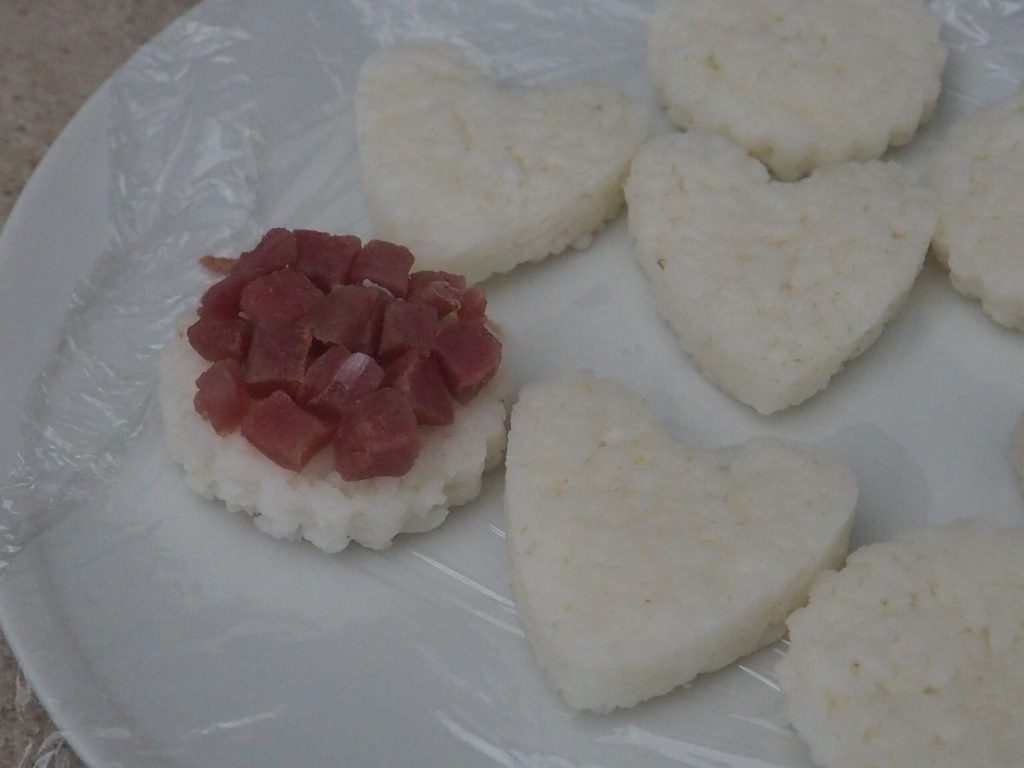 Den Reis auf ein feuchtes Tuch in einer Höhe von etwa einem Zentimeter verteilen. Die Hände befeuchten, um ein Anhaften zu verhindern. Mit Förmchen von einem Durchmesser von 5,5 cm Formen ausstechen (es werden 6 oder 7).