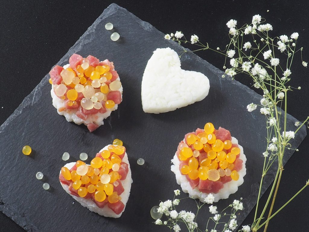 Ein wenig in Würfel geschnittenen tiefgefrorenen Thunfisch darauf legen (wenn gewünscht, kann auch tiefgefrorener Lachs verwendet werden) und dann die Orangen- und Zitronenkaviarkugeln. Die Menge der im Rezeptlink angegebenen Zutaten, die hier zu finden sind, muss verdoppelt werden, sowohl für den Orangen- als auch für den Zitronenkaviar.