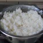 Gut mischen und dann den Sirup über den Reis gießen, dabei versuchen, ihn vollständig zu befeuchten. Mit einem Holzlöffel umrühren oder mit den Händen mischen, um die Flüssigkeit gleichmäßig zu verteilen.