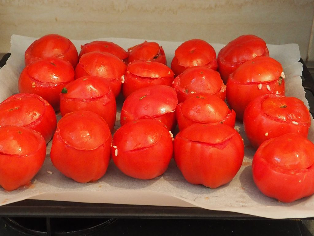 Es wäre besser, sie nicht zu voll zu füllen, da der Reis beim Backen aufquellen könnte und die Tomaten platzen könnten.