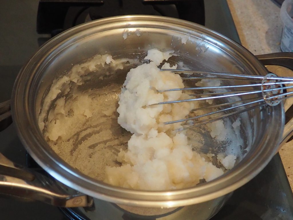 • Geben Sie die Masse in einen kleinen Topf und erhitzen Sie sie bei niedriger Hitze, dabei ständig mit dem Schneebesen rühren.