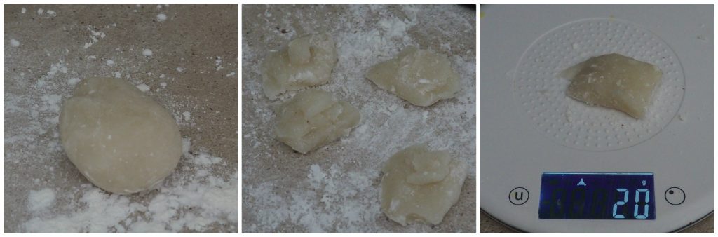 • Bearbeiten Sie den Teig nun schnell, mit bemehlten Händen, drücken Sie ihn leicht flach und teilen Sie ihn in 8 Teile, jedes wiegt etwa 20/25 Gramm.