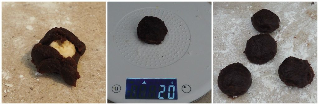 Formen Sie die Kugel gut, damit der Teig die Marmelade aus roten Bohnen und Banane gut umschließt.