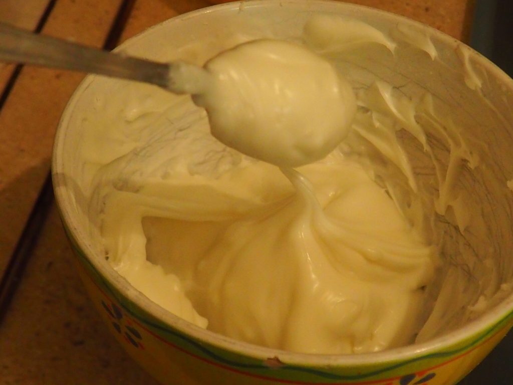 Kochen Sie in der Mikrowelle bei 1000 Watt für 30 Sekunden, rühren Sie um, kochen Sie weitere 30 Sekunden, rühren Sie erneut um. Wiederholen Sie das für weitere 30 Sekunden, jetzt beginnt es zu festigen, versuchen Sie, mit einer Gabel alle festen Teile zu zerkleinern, um es gleichmäßig zu machen.