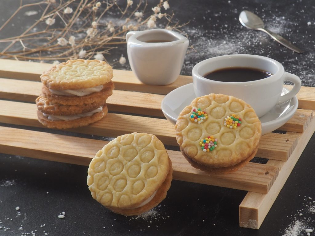 Die Mürbeteigkekse gefüllt mit Buttercreme sind ein leckeres Gebäck, das man am Ende einer Mahlzeit oder zum Frühstück servieren kann, köstlich, wenn man hineinbeißt und etwas Creme vom Rand herausquillt.