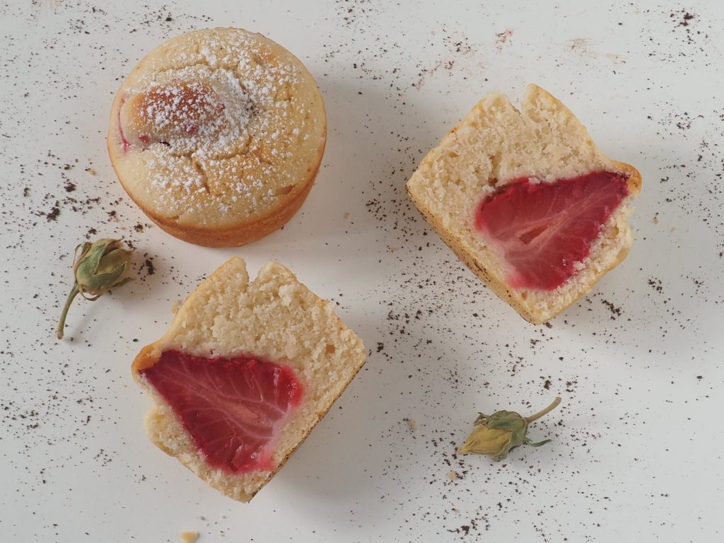 Diese Muffins mit Erdbeerherz sind wirklich köstlich: weich und zart, mit einer wirklich leckeren Überraschung im Inneren: eine ganze Erdbeere in der Mitte. Probieren Sie sie aus, und Bissen für Bissen werden sie Sie sicherlich erobern. Außerdem sind sie glutenfrei und ohne Butter.