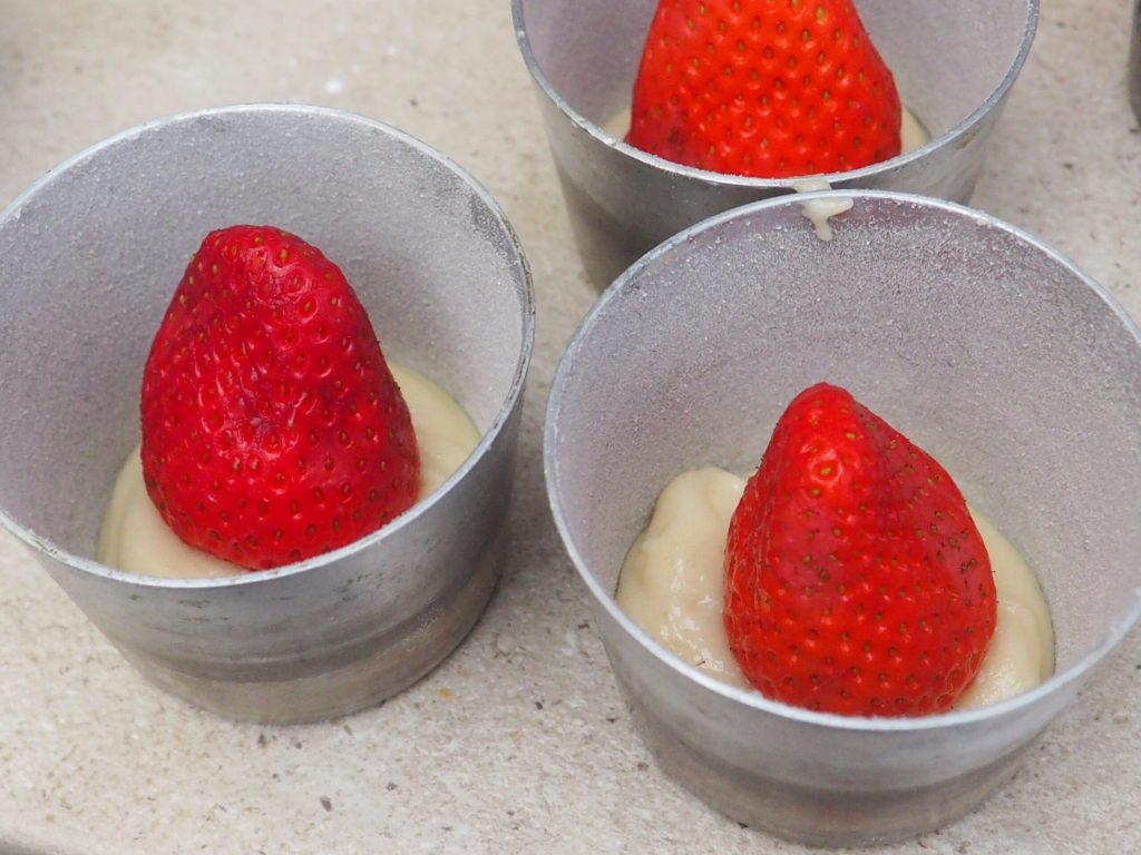 Geben Sie einen Löffel Teig auf den Boden der Förmchen, dann die Erdbeere in die Mitte, verteilen Sie den restlichen Teig auf die sechs Förmchen, sodass sie etwas mehr als zur Hälfte gefüllt sind.