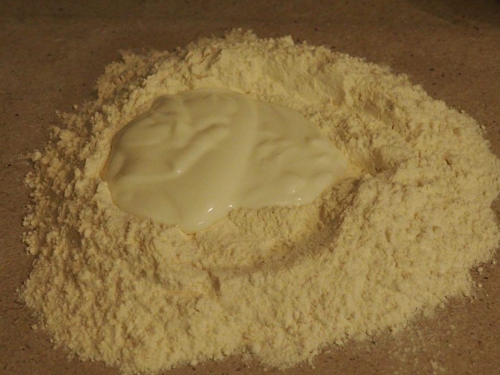 Streuen Sie das Mehl auf ein Brett in Form eines Brunnens, fügen Sie in der Mitte das Joghurt, das Salz und das Natron hinzu.