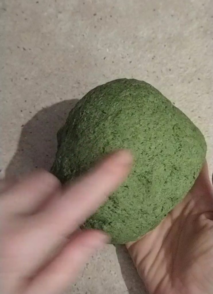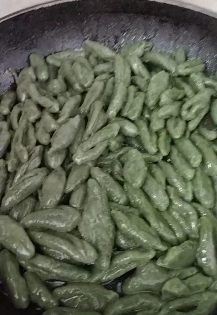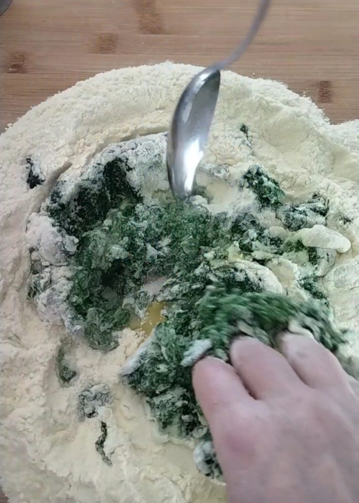 • Legen Sie den Hartweizengrieß auf eine Arbeitsfläche, fügen Sie die Spinatcreme, das Öl, das Salz und nach und nach das Wasser hinzu. Ich empfehle, nicht alles auf einmal hinzuzufügen, da es zu viel sein könnte, da die Feuchtigkeit des Teigs auch von der Wassermenge im Spinat abhängt.