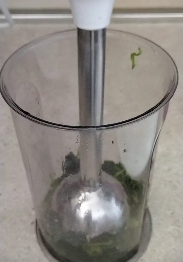 • Ich habe gefrorenen Spinat verwendet, ihn aufgetaut, gut ausgedrückt, um das gesamte überschüssige Wasser zu entfernen, und ihn mit einem Stabmixer püriert, bis eine Creme entstanden ist.