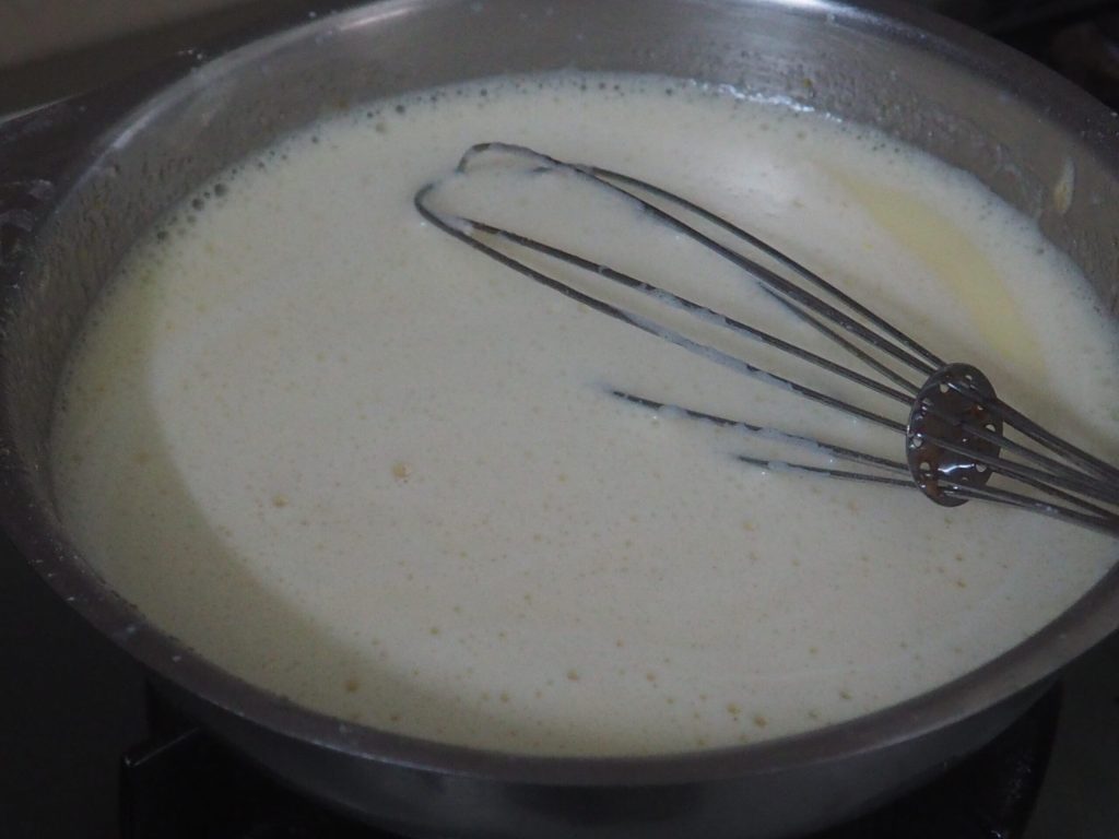 • Erhitzen Sie die Milch zusammen mit der Vanillin in einem Topf fast bis zum Sieden, und gießen Sie sie dann in einem dünnen Strahl in die Eiermischung. Schnell umrühren und zurück in den Topf geben, für einige Minuten kochen lassen, bis sie eindickt. Gießen Sie die Creme in einen Behälter, lassen Sie sie leicht abkühlen für etwa eine Viertelstunde, fügen Sie 30 g Butter hinzu und mischen Sie mit dem Schneebesen. Nun decken Sie sie mit Frischhaltefolie ab und lassen Sie vollständig abkühlen.
