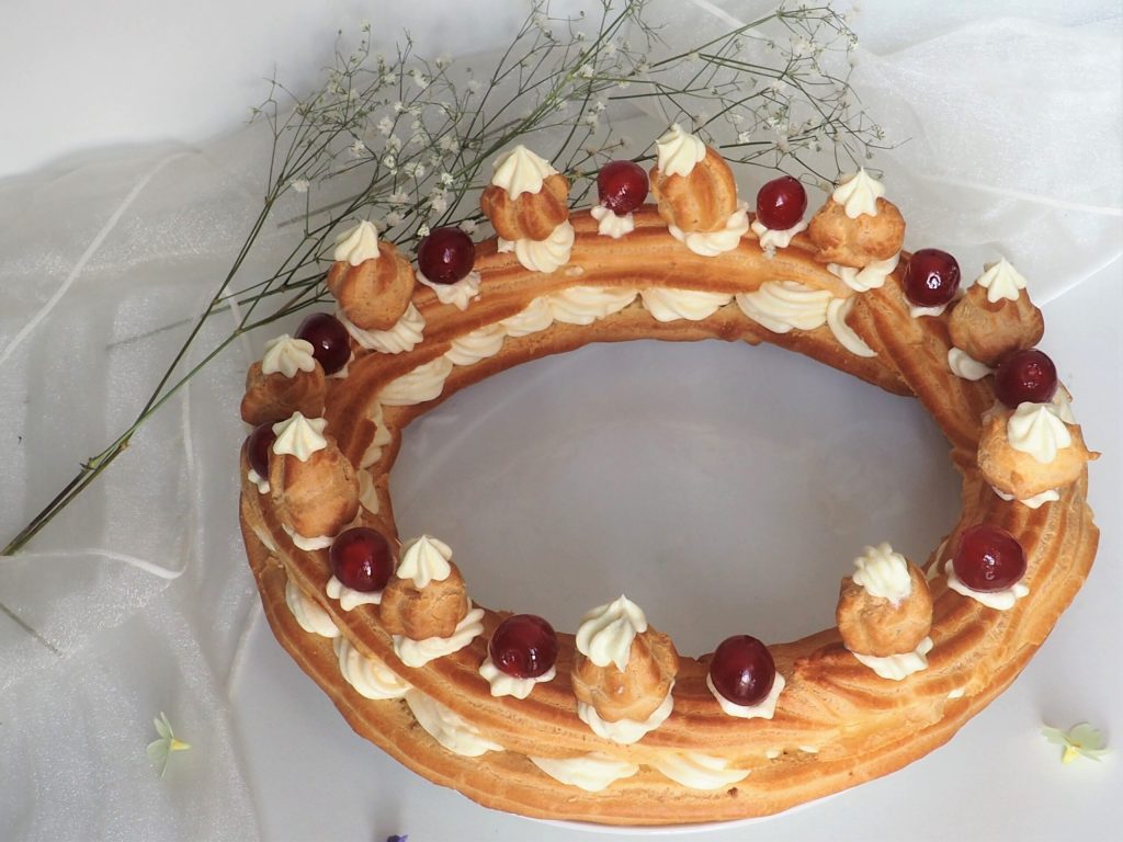 Die Paris Brest gefüllt mit Mousseline-Creme ist eine delikate Süßspeise, zubereitet mit Brandteig und einer samtigen, butterreichen Creme. Dieses Dessert wurde 1891 vom Konditor Louis Durand erfunden, um das Radrennen Paris-Brest-Paris zu ehren, da die runde Form an das Rad eines Fahrrads erinnert.