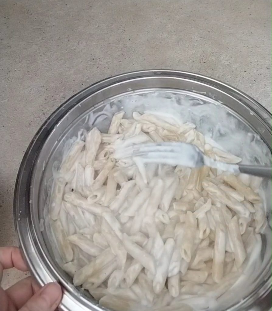 Gut mischen, bei Bedarf etwas Nudelwasser hinzufügen, es sollte eine weiche und glatte Creme sein.