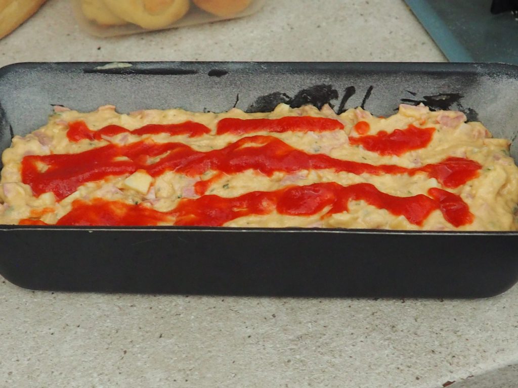 • Sprühen Sie mit Butter-Spray (Backtrennmittel für Kuchen) und mehlen Sie eine Pflaumenkuchenform von 27×10 cm, geben Sie die Mischung hinein und dekorieren Sie die Oberfläche mit dem restlichen Esslöffel Tomatensauce.