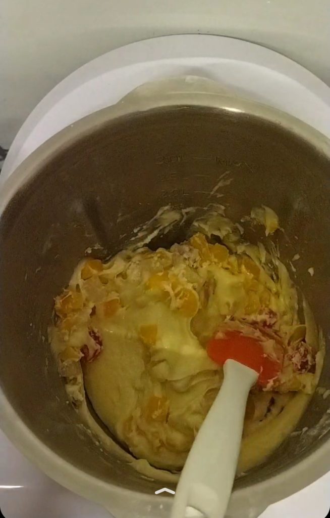 Fügen Sie das Obst der Masse hinzu und mischen Sie mit einem Gummischaber.